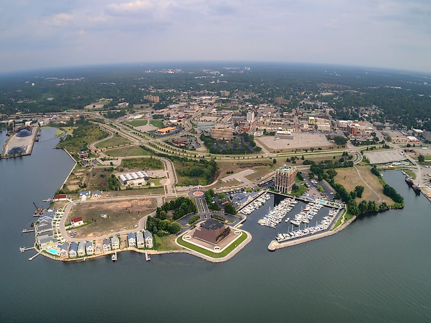 ミシガン州マーケット、スペリオル湖畔の港湾都市の空撮。
