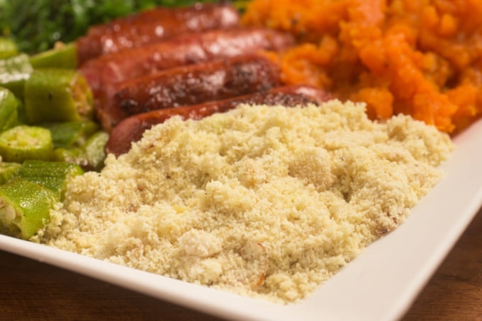 ファロファは、ブラジル全土で毎日食べられる主食です。メインディッシュのさまざまなフレーバーとテクスチャーを強化し、補完するために、肉やシチューと一緒に伴奏として散らばったり、詰めたり、食べたりします。軽くてサクサクしたテクスチャーがあり、美しい黄金色の色合いを達成するまで、調味料と軽く乾杯することで作られています。