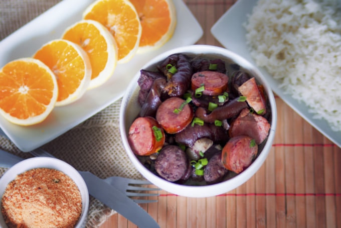 黒豆、牛肉、豚肉が楽しく集まって、ブラジルの有名な国立料理であるフェイジョーダを作ります。ネイティブ、アフリカ、ポルトガルの食料文化の完璧な融合であるこの濃厚で風味のあるシチューは、香りの良いハーブとスパイスの混合物で、豚の足、尾、耳などの安価なカットを含む、さまざまな塩漬けやスモークの肉を煮ることによって作られています。その後、ソテーしたコラードグリーン、ライス、オレンジ色のスライス、ファリファの散布が添えられます。