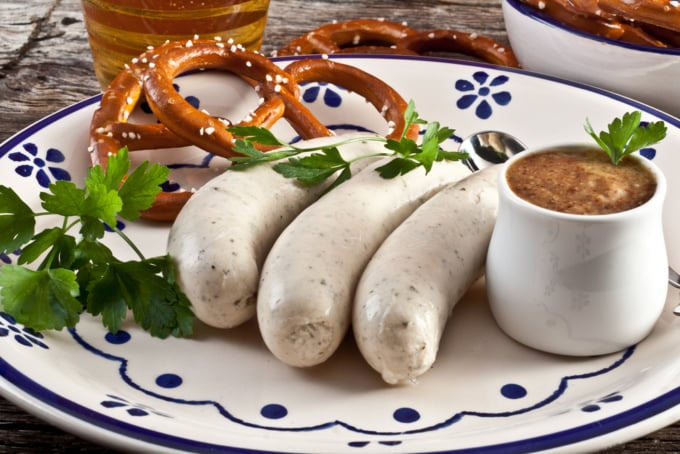 文字通り「ホワイトソーセージ」に翻訳されているワイスヴルストは、準備に使用されていないため、伝統的に正午までのみ提供されていたおいしいバイエルンの専門です。それらは、軽度に味わったミンクスした子牛肉とバックベーコンを豚のケーシングに詰めることによって作られ、通常、甘いドイツのマスタード、塩辛いプレッツェル、小麦ビールの少量と一緒にいくつか添えられます。