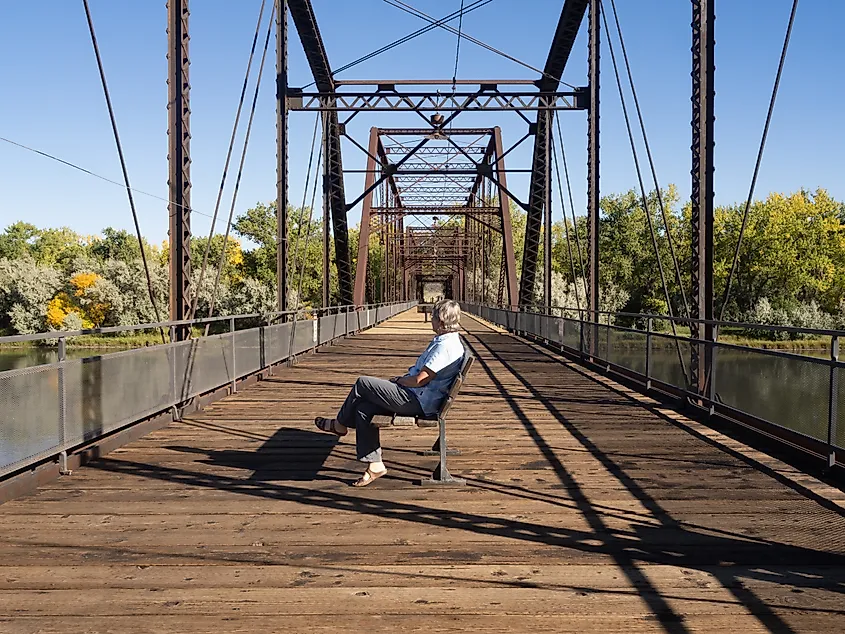 歴史的なフォート ベントン橋のベンチに座る女性。