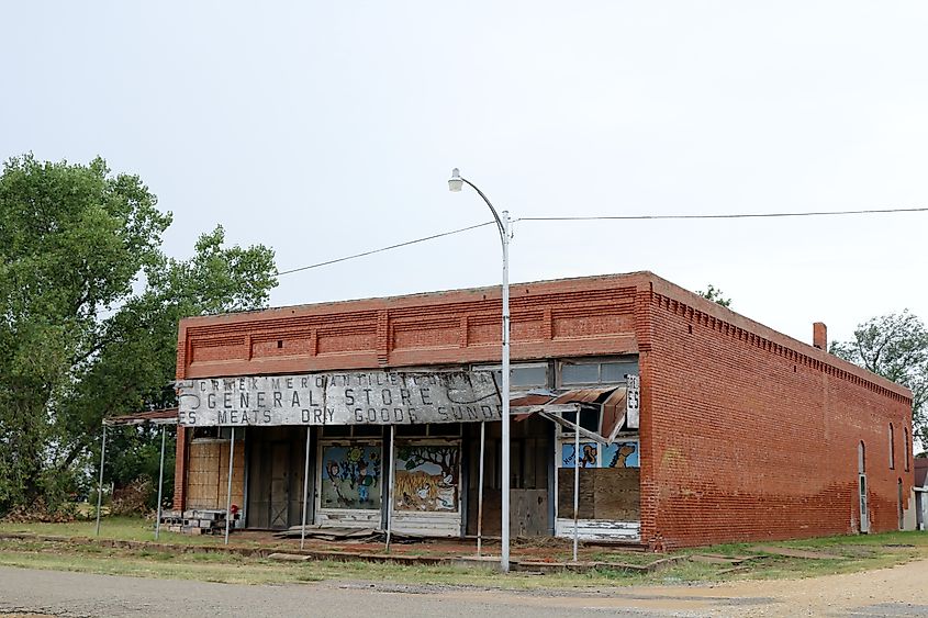オクラホマ州ディア・クリークの町、メイン・ストリートにあるこの雑貨店は、1899年に設立されました。開店当初、店舗は木造でしたが、すぐに1905年に6,000平方フィートのレンガ造りの建物に建て替えられました。ブラックウェル・ジャーナル・トリビューン紙によると、ディア・クリーク・マーカンタイルは現在、グラント郡で最も古い商業ビルです。国家歴史登録財にも登録されています。この店はすぐに重要な地域資源となり、オクラホマ州北西部の農家にとって、さまざまな乾物、肉、その他の食料品を扱う総合店として機能しました。 1994年に閉店するまで100年近く営業していたお店です。