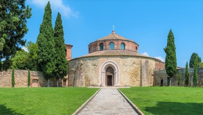 旧市街の中心部から北西へ15分ほど歩くと、ペルージャに現存する最古の教会であるサンタンジェロ教会が見えてきます。芝生の上に丸い石造りの建物がぽつんと建っており、その愛らしい佇まいがひときわ目を引きます。この教会は 5 世紀から 6 世紀にかけて建てられ、イタリアで最も古い教会の 1 つです。ドーム型の天井は 8 本の梁で支えられ、その梁は円形に配置された 16 本の柱で支えられています。