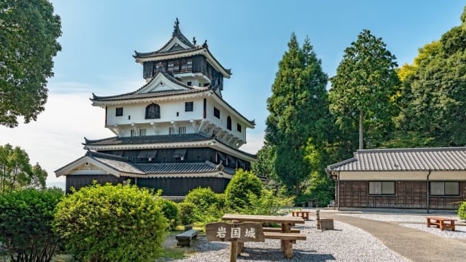 イワクニ城は、キンタイ橋からの印象的な光景であり、建築スタイルのユニークなブレンドの山の上に腰掛けています。訪問者は、ロープウェイのサミットに到着したり、トレイルに沿ってゆっくりとハイキングしたりすることができます。