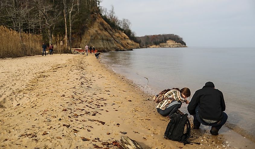 メリーランド州ラスビー近くのカルバート クリフス ビーチには、先史時代の中新世の化石を探す観光客が集まります。画像クレジット Nicole Glass Photography (Shutterstock 経由)