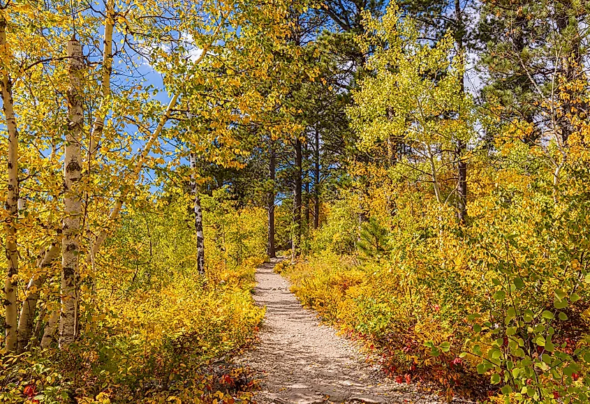 サウスダコタ州デッドウッド、マウント・ルーズベルト・フレンドシップ・タワー・トレイルの秋の色。