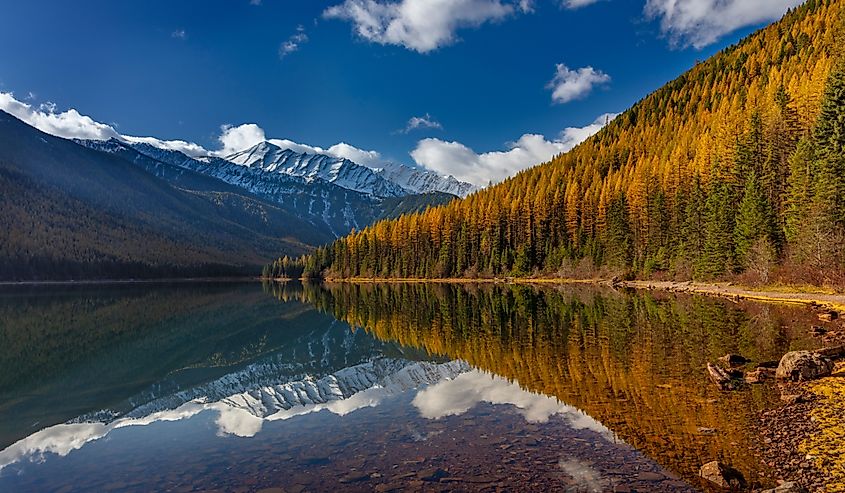 秋のフラットヘッド国有林のスタントン湖にグレート ノーザン マウンテンが映ります。