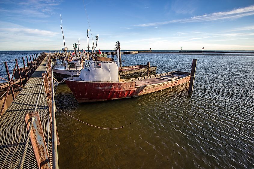 スペリオル湖沿岸のホワイトフィッシュ・ポイント州立港に停泊する商業漁船。編集クレジット: ehrlif / Shutterstock.com