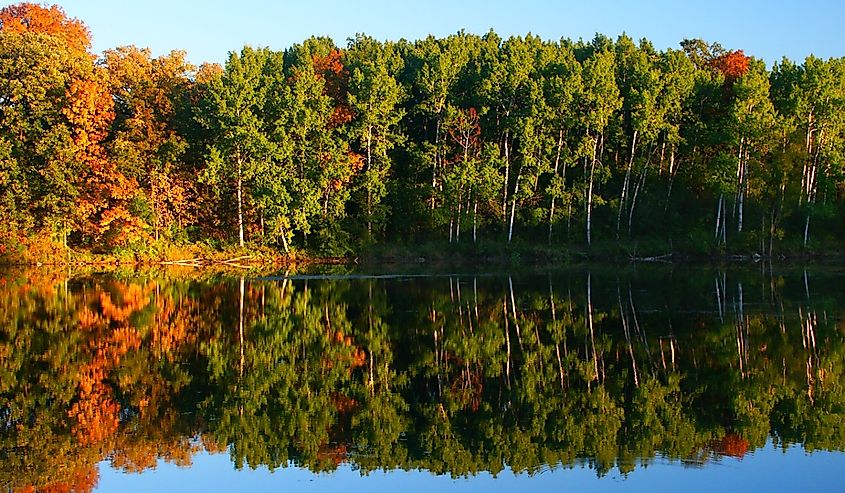 ウィスコンシン州ケトル・モレーン州立森林公園の池に映る美しい秋の色。
