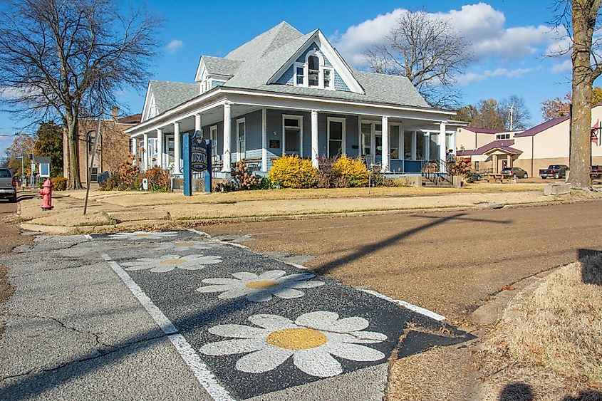 アーカンソー州フォレストシティのラッシュゲイツ・ホームにあるセント・フランシス郡博物館の前にある、花で描かれた横断歩道。画像クレジット Nina Alizada、Shutterstock より