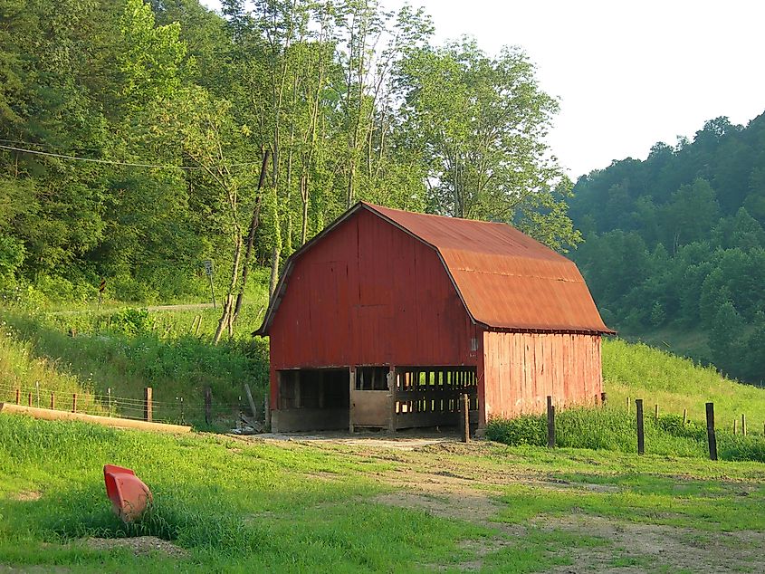 左手にある素朴な納屋、ウェストバージニア州、田園地帯に囲まれています。編集クレジット:ジミー・エマーソン経由Flickr