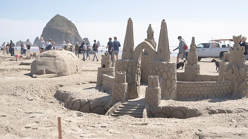 キャノンビーチサンドキャッスルコンテスト中にヘイスタックロックの前のサンドキャッスル。写真クレジット:キャノンビーチ。