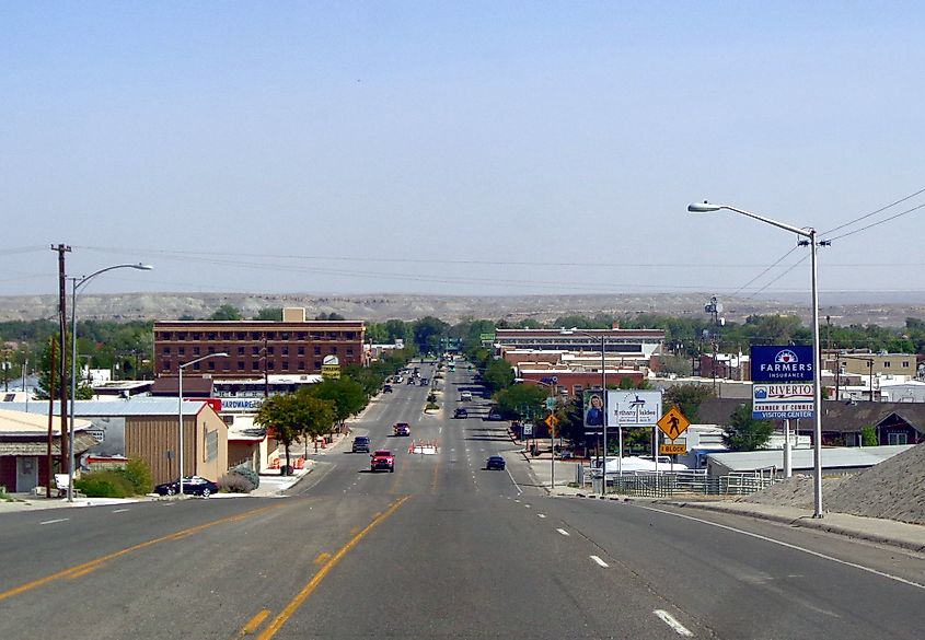 ワイオミング州リバートンの町のウエストメインストリートにある。 Vasiliymeshko 著 – 自身の作品、CC BY-SA 4.0、ウィキメディア コモンズ。