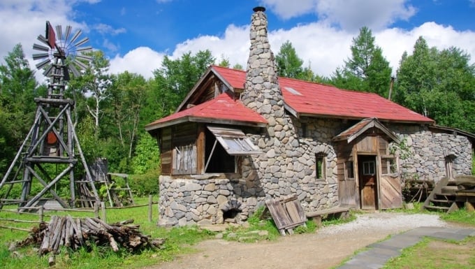 この写真は五郎の石の家です。石造りなので頑丈なイメージがあり、赤い屋根と近くにある風車がとても印象的です。背景には木々が生い茂り、目の前には広大な畑が広がっています。そんなのどかな風景の中で、心穏やかに暮らせる家です。この家は火山活動後の畑の石を使って作られたと言われています。比較的シンプルな内装と手作り感がポイントです。