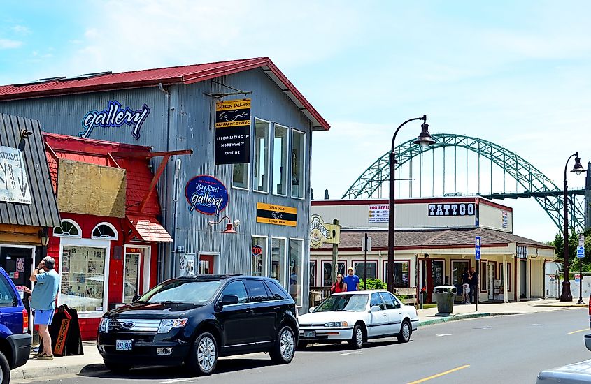 ヤキーナ湾の橋を背景にニューポートの漁師町の正面ストリート ビュー。編集クレジット: Yeksu / Shutterstock.com