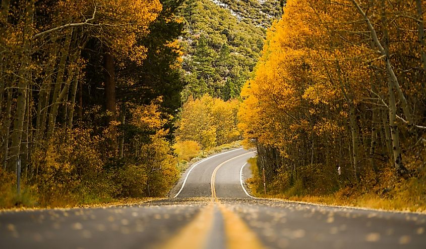 カリフォルニア州ジューン湖の秋の間に、黄色のポプラの木が茂る秋の道。