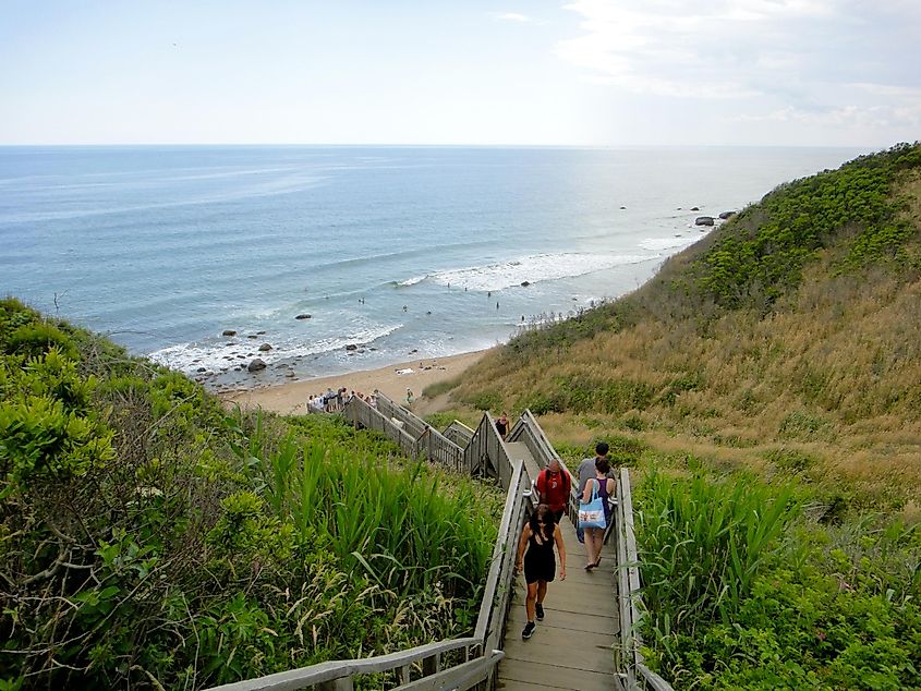 ロードアイランド州ニューショアハムにあるモヒガン ブラフスとビーチに続く階段。画像クレジット quiggyt4 (Shutterstock 経由)。
