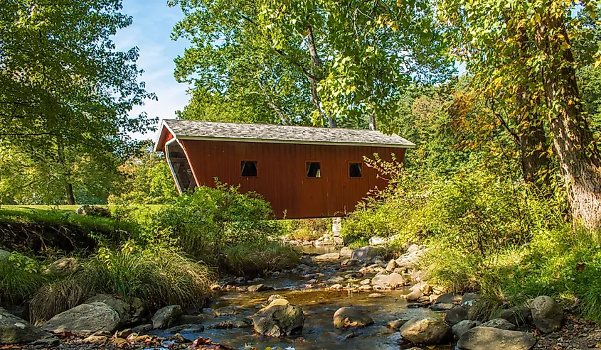 ケント フォールズ州立公園のフォールズ ブルックにかかる屋根付きの橋。
