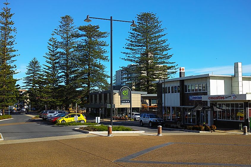 海岸沿いのホリデータウン、ポート マッコーリーにある市内中心部の通り。ホテル、アパートの建物、店舗が立ち並ぶ。