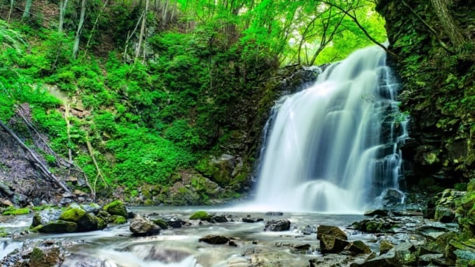 ちょうど下流の「Uodome Falls」は、同様に印象的な光景を誇っています。魚が上流に泳ぐのを防ぐ猛烈な水にちなんで名付けられたこの3段のカスケードは、鮮やかな葉が暗い岩と泡立ったスプレーと美しく対比する秋に特に魅惑的です。浅野大滝と一緒に、これらの2つの滝は、北川の劇的な自然の美しさを紹介しています。