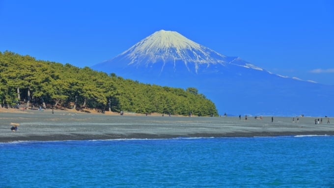 三保松原からの富士山の眺めは息を呑むほどの美しさで、多くの有名な芸術家に絵画の題材としてインスピレーションを与えてきました。松林は海岸沿いに約 7 キロメートルにわたって広がり、約 30,000 本の松の木が植えられています。天女が舞い降りたとされる「羽衣伝説」の舞台としても知られています。また、美しい初日の出を見るスポットとしても人気があり、毎年元旦には初日の出を見ようと多くの人が集まります。