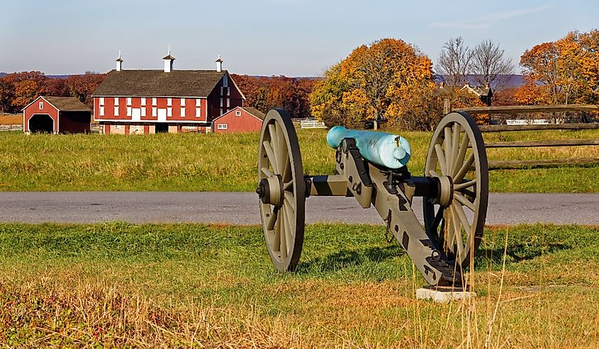 ペンシルベニア州アダムズ郡のゲティスバーグ国立軍事公園の戦場にある大砲と納屋。
