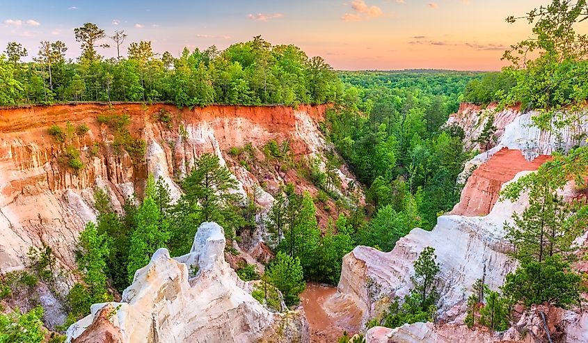 プロビデンス キャニオンは完全に自然の驚異のように見えますが、このランドマークは実際には何世紀も前の劣悪な農業慣行の結果です。 1800 年代に侵食制御を行わずに大規模な耕作が行われたため、雨水が柔らかい粘土質の土壌に巨大な渓谷を刻み込み、最終的には赤、オレンジ、ピンク、白の堆積物の層が露出した、高さ 150 フィートを超えることもある 1,000 エーカーの深い峡谷の景観を作り出しました。興味深いことに、光や湿気に応じて色が変化し、そのエリアの外観が常に変化します。