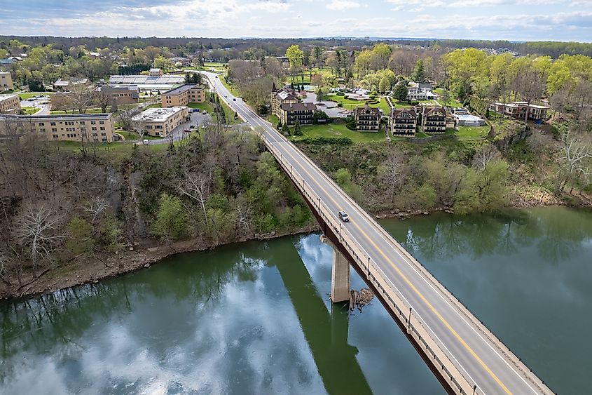 メリーランド州シャープスバーグとウェストバージニア州シェパーズタウンを結ぶシェパーズタウン パイク ブリッジの空撮。