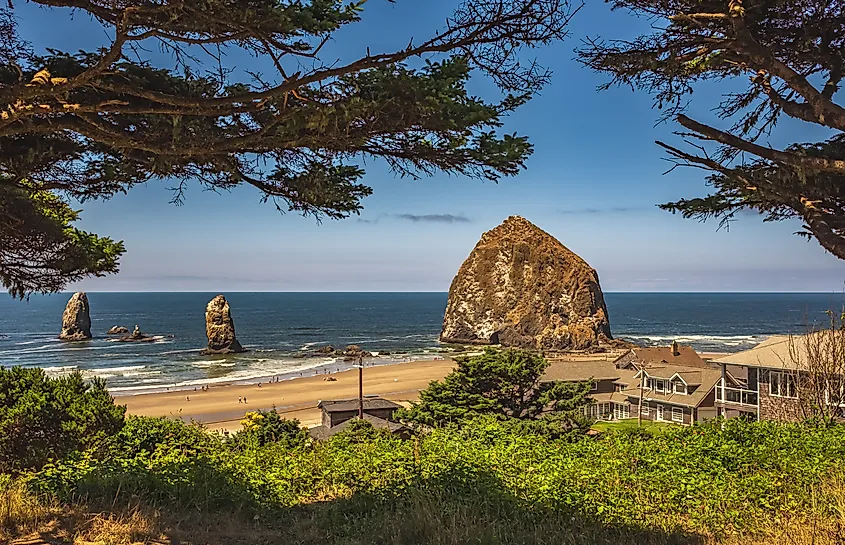 オレゴン州キャノンビーチの海岸沿いの住宅とヘイスタック ロックの眺め。