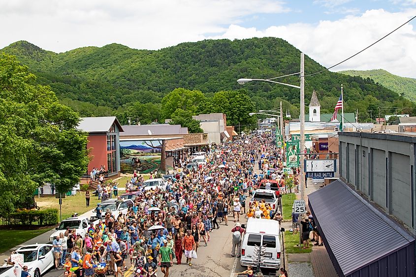 アパラチアントレイルデイズフェスティバル中のハイカーパレード。ダマスカスの町。