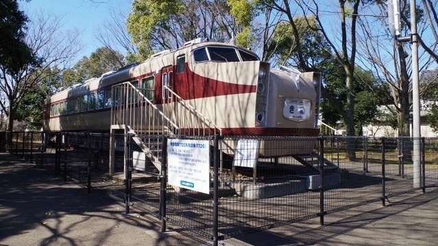 園内で子どもたちに人気なのが、東武鉄道ロマンスカー「きぬ号」の先頭車両が展示されているスポット。運転室内のレバーを触って動かすこともできます。