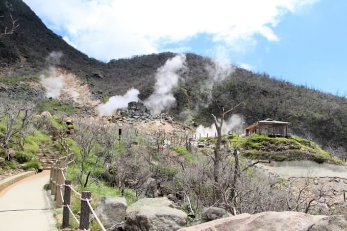 大涌谷の自然を空からではなく地上から体感したい方には、遊歩道があります。立ち上る噴煙を間近で見ると本当に迫力があります。一見険しい道に見えますが、よく整備されており、多くの観光客に人気です。