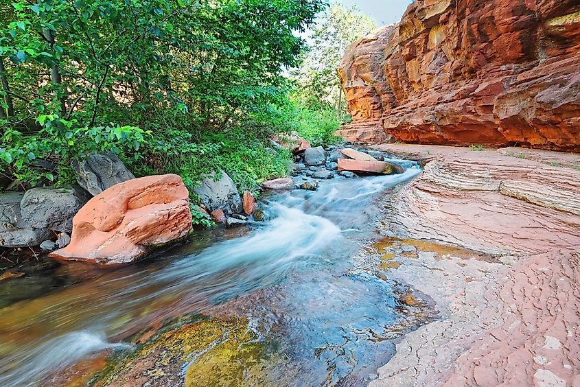 同じハイウェイ 89A 号線を走り続けると、スライド ロック州立公園がセドナの反対側、レッド ロックからわずか 25 マイルの距離にあります。ここでは、オーク クリークがかつての農場兼リンゴ農園をまっすぐに貫いており、80 フィートの藻に覆われたセクション (公園の名前の由来となっています) は、暑すぎる夏の観光客が楽しめる自然の滑り台となっています。この滑りやすい砂岩の水路のほかに、スライド ロック州立公園の 43 エーカーの敷地には、ナローヘッド ガーター ヘビ (Thamnophis rufipunctatus) が現存する最大の個体群が生息しています。