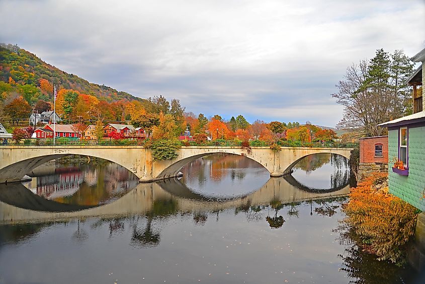 マサチューセッツ州シェルバーンフォールズのディアフィールド川にかかるトラス橋。編集クレジット: Nina Alizada / Shutterstock.com
