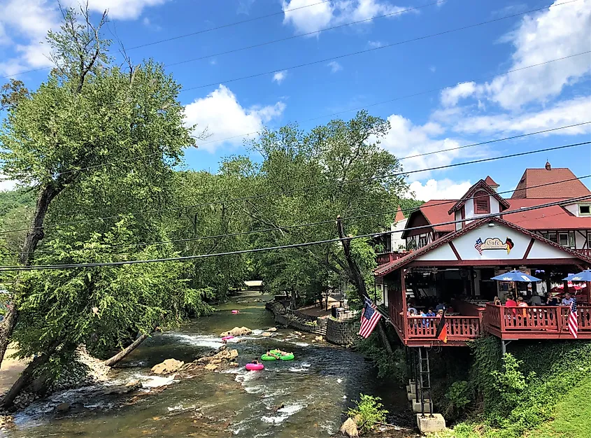 観光客はジョージア州ヘレンのチャタフーチー川でチュービングを楽しんでいます。編集クレジット: Ancha Chiangmai / Shutterstock.com。