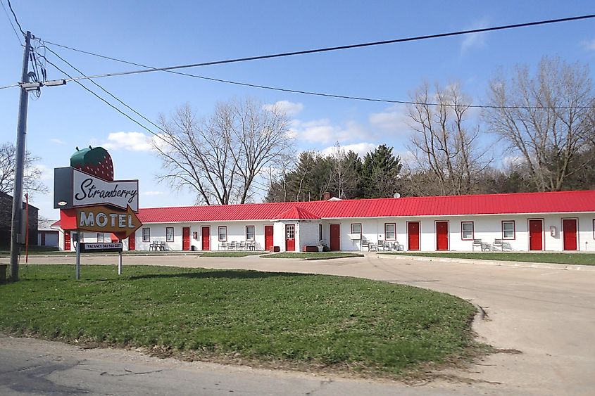 ストロベリー モーテル – アイオワ州ストロベリー ポイント、ポール セイブルマン著 – ストロベリー モーテル – アイオワ州ストロベリー ポイント、CC BY 2.0、ウィキメディア・コモンズ