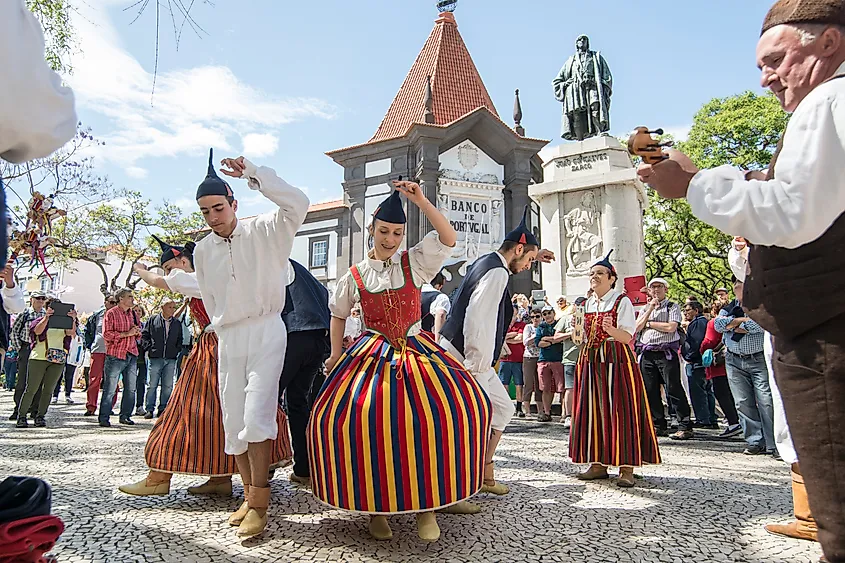 伝統的なマデイラ民俗グループがマデイラ島のフンシャルで演奏します。編集クレジット: amnat30 / Shutterstock.com