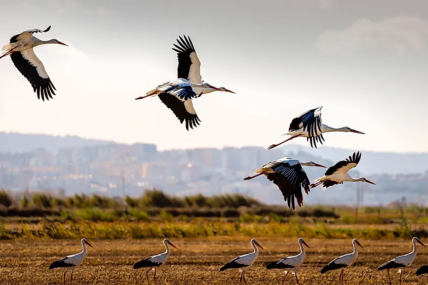 コウノトリはリスボンからそれほど遠くないビラ・フランカ・デ・シーラの湿地帯近くを飛び立ちます。編集クレジット: Pedro Rendas / Shutterstock.com