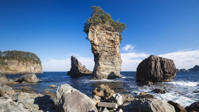 2011 年の地震の前、この島は防波堤で本土とつながっており、灯台がありました。しかし、津波により島は孤立してしまいました。その後灯台は再建され、弁天様は地元岩手の人々から今も崇められ続けています。釣りスポットとしても人気の島なので、釣り好きには特におすすめです。