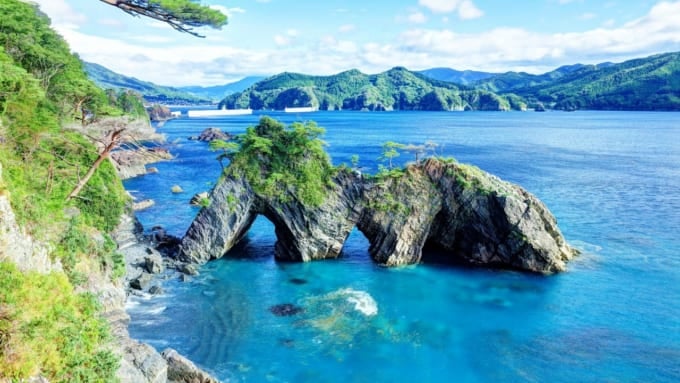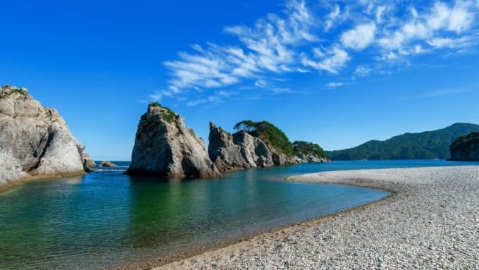 宮古市にある浄土ヶ浜は、国指定の名勝であり、岩手県有数の海岸観光地の一つです。白い岩の崖、緑豊かな木々、透き通った青い水のコントラストが息を呑むような風景を作り出しています。白い砂浜と自然のままの海は、特に夏に海水浴や日光浴を目的に多くの観光客を魅了します。