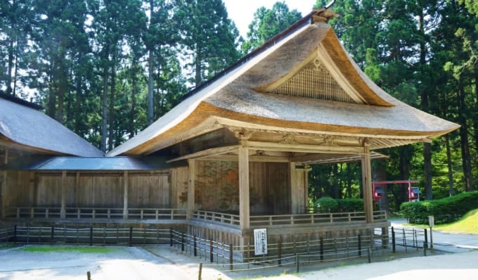 中尊寺金堂の近くに位置する白山神社の鮮やかな赤い鳥居は、歴史ある能舞台である神楽殿につながっています。この神楽殿は、東日本に現存する最古の能舞台とされ、国の重要文化財に指定されています。