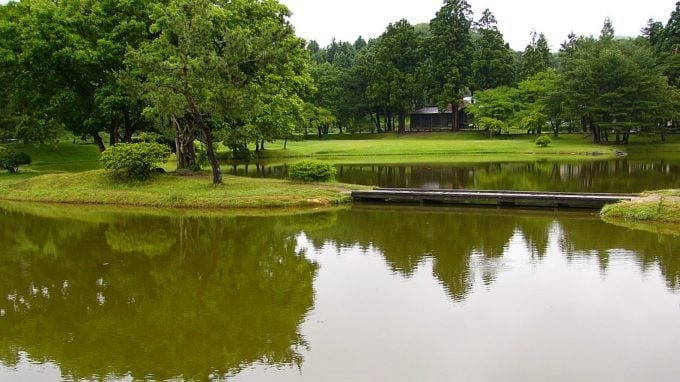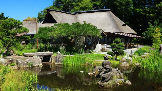 岩手県遠野市にある高室水光園は、宿泊施設、釣り堀、遠野名物のジンギスカンなどの郷土料理を提供する静かな隠れ家です。緑豊かな庭園に囲まれており、リラックスするのに最適な場所です。宿泊施設のハイライトは、特徴的な曲線屋根と囲炉裏が特徴の伝統的な南部曲り家に宿泊し、本物の歴史を体験できることです。