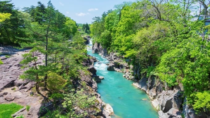 国の名勝天然記念物に指定されている厳美渓は、岩手県で必ず訪れたい観光地です。約2キロメートルにわたるこの渓谷は、印象的なエメラルドグリーンの海とダイナミックな景観で有名です。季節にもよりますが、ゴールデンウィーク頃までは桜、秋には鮮やかな紅葉が楽しめます。
