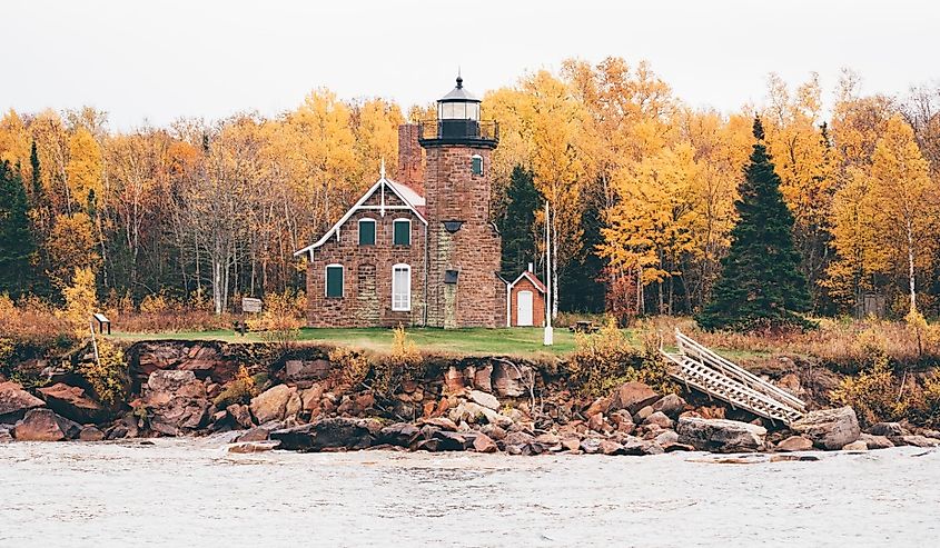 秋のウィスコンシン州アポストル諸島国立湖岸のスペリオル湖にあるサンド島灯台。