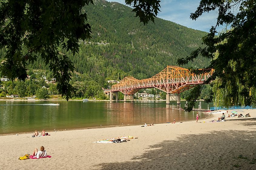 ブリティッシュコロンビア州ネルソンにあるクートニー湖沿いのビーチ。