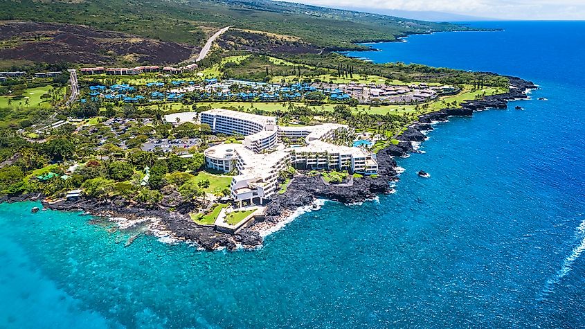 空から見えるハワイ州カイルア・コナのリゾートと別荘。