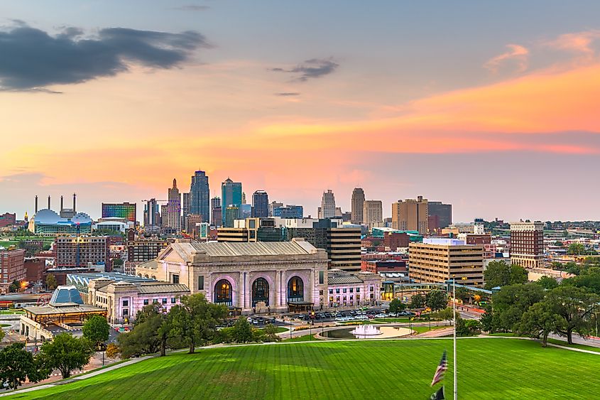 米国ミズーリ州カンザスシティ、夕暮れ時のユニオン駅のあるダウンタウンのスカイライン。