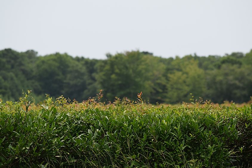 サウスカロライナ州のチャールストン・ティー・ガーデンにある、きちんと整えられた茶の木が並ぶ。