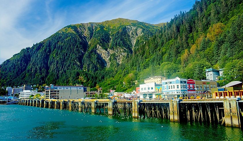 アラスカ州ジュノー・ドック沿いのカラフルな家々。