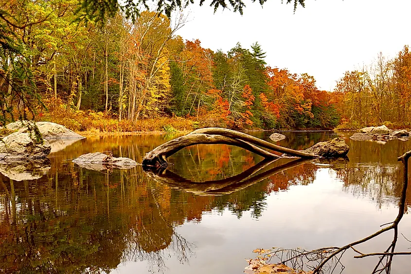 コネチカット州ニューハートフォードのネポーグ州立森林公園にあるファーミントン川沿いの紅葉。